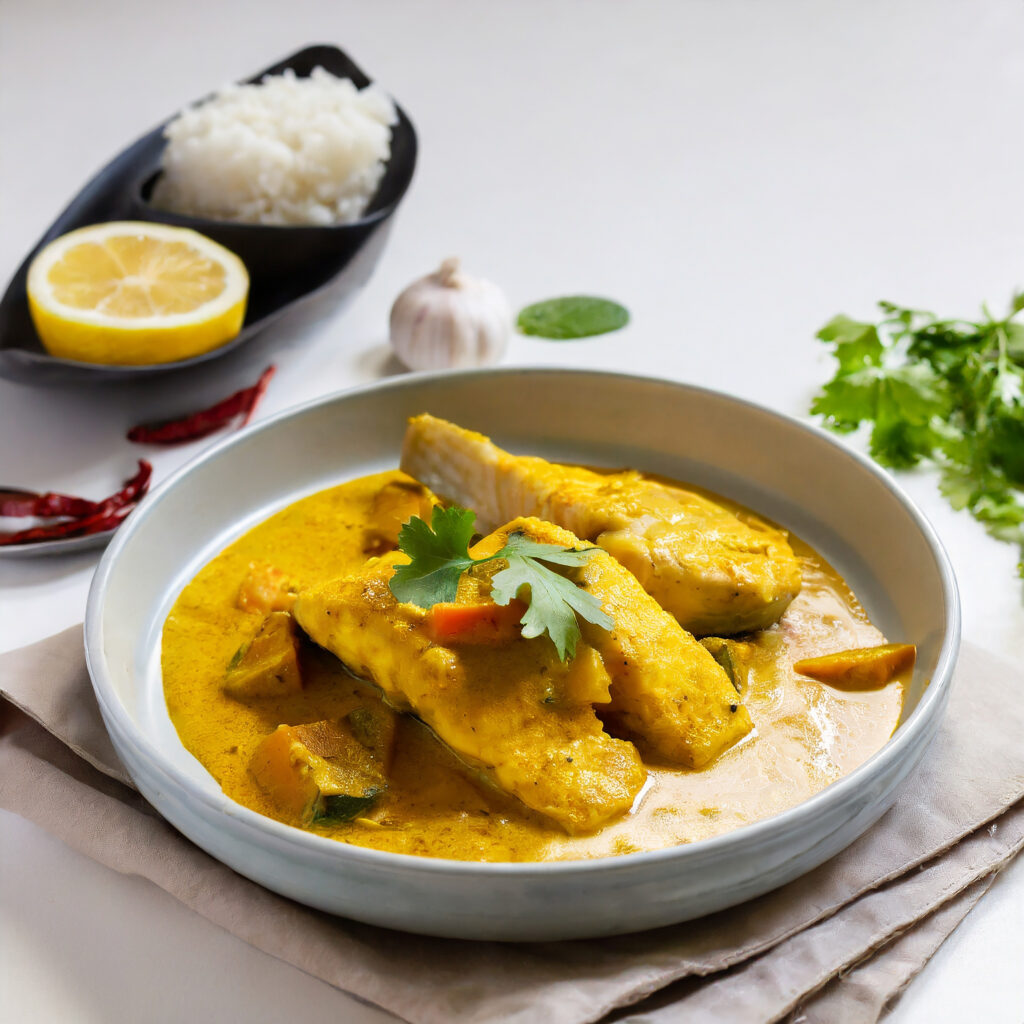 Spicy Fish curry_Seer fish curry ,traditional Indian fish curry, white background